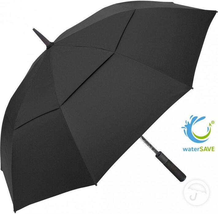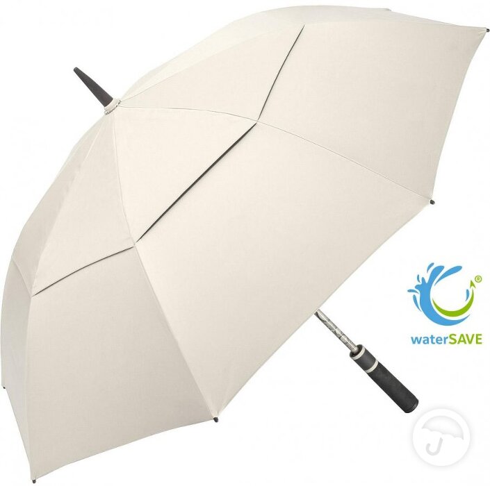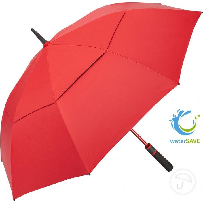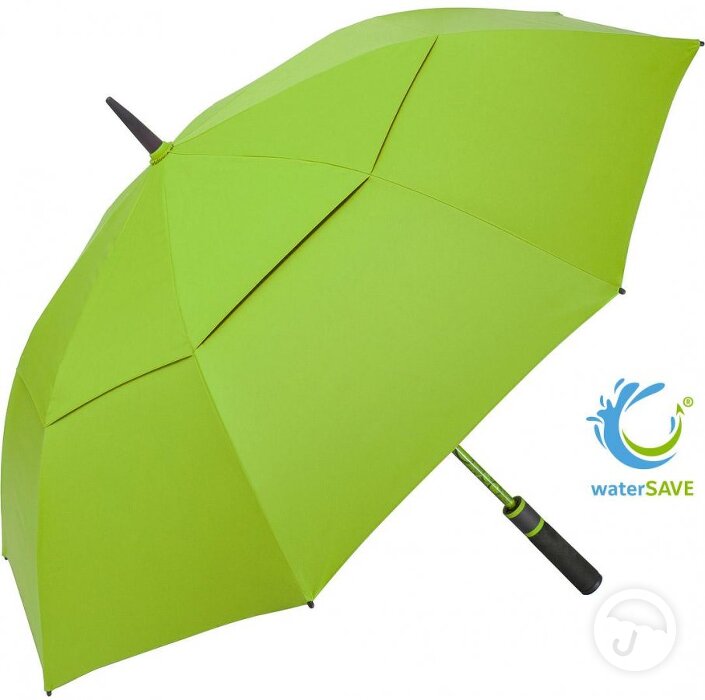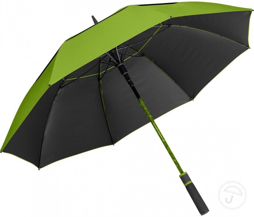 FARE prekinio ženklo automatinis vėjui atsparus golfo skėtis ventiliuojamu kupolu, stiklo pluošto karkasu bei tiesia minkšta rankena su spalvotais žiedais. Strypas tos pačios spalvos kaip kupolas su vandens lašų imitacija.